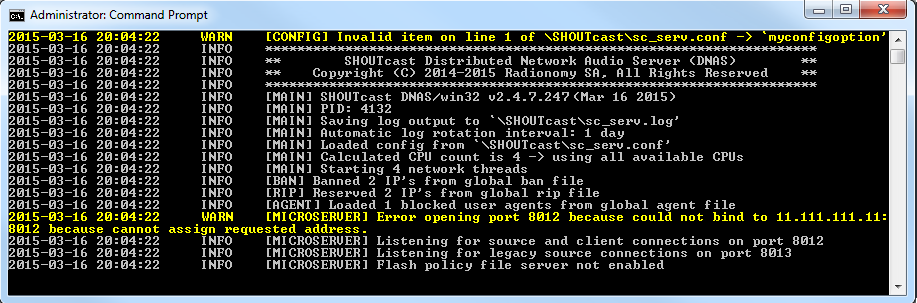If no file / an invalid file is specified then the DNAS server will abort loading once it has looked for sc_serv.ini or sc_serv.conf in the same folder as sc_serv (using sc_serv.ini first and then sc_serv.conf as applicable). If a default configuration file (sc_serv.conf or sc_serv.ini) is not found then you will be shown a prompt for the configuration file to choose from.